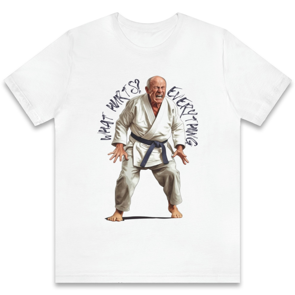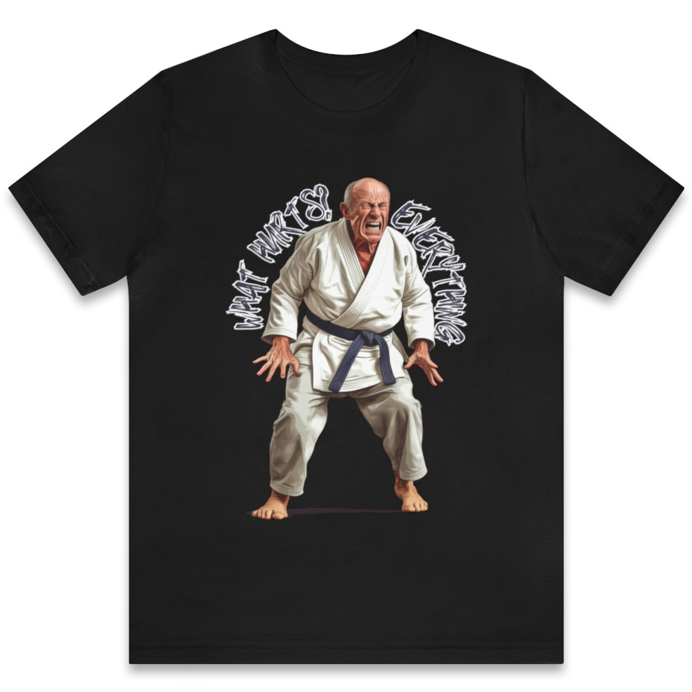 Showcase your sense of humor and the reality of aging with our What Hurts design. Featuring an older man in pain and the text, “What Hurts? Everything,” this witty shirt is perfect for those who can laugh at life’s aches and pains.