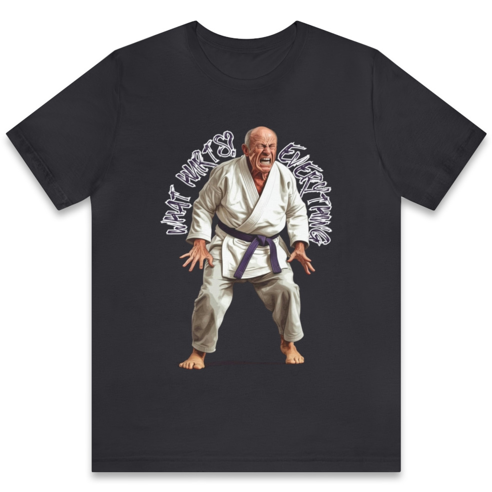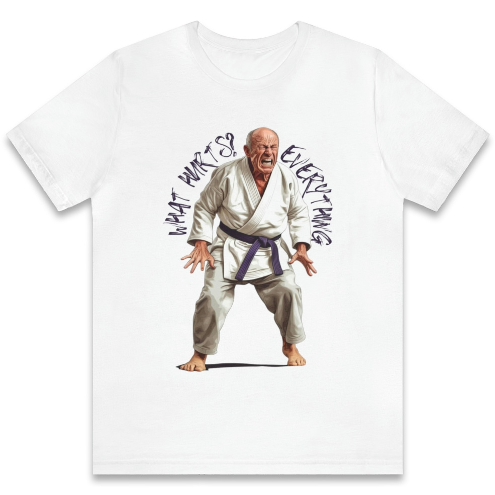Showcase your sense of humor and the reality of aging with our What Hurts design. Featuring an older man in pain and the text “What Hurts? Everything,” this witty shirt is perfect for those who can laugh at life’s aches and pains.